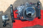 Nachdem am Wochenende mein 5″ Domport eingetroffen ist , habe ich heute das Gehäuse das erste mal unter Wasser getestet . Zum Glück war alles dicht . Hatte leider noch nicht die manuelle Scharfstellung eingebaut , so stellte der Autofokus immer auf die Wassertropfen am Domport scharf . Also , nächstes mal ohne Autofokus . Ein weiters Problem sind Wassertropfen auf dem Domport , unter dem Wasser kein Problem , aber bei Halb-und Halbaufnahmen über Wasser ein Problem . Am besten vor dem Foto den Domport kurz unter Wasser tauchen . Obwohl der Port für das Sigma 15/2.8 Fisheye konstruiert wurde , sieht man in den Ecken Randabschattungen . Ansonsten lassen sich die wichtigsten Funktionen von außen gut bedienen .